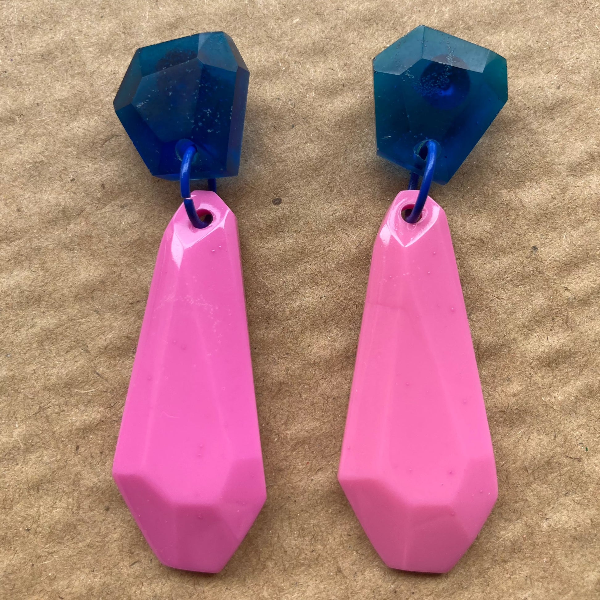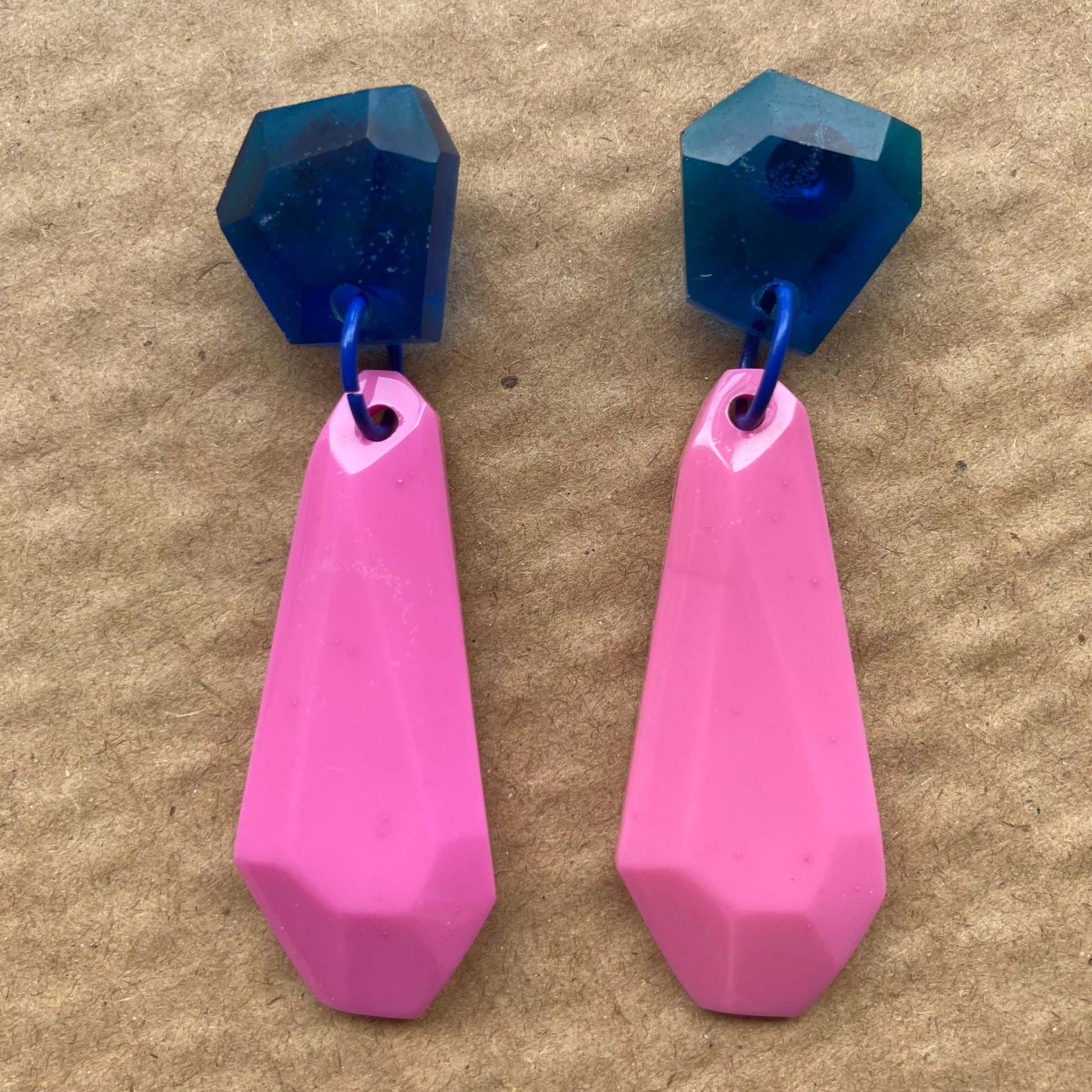 A fun dangle featuring a dark blue translucent top and a lovely mid pink geometric dangle. They're super light and so fun. Sure to become your new favourite!
