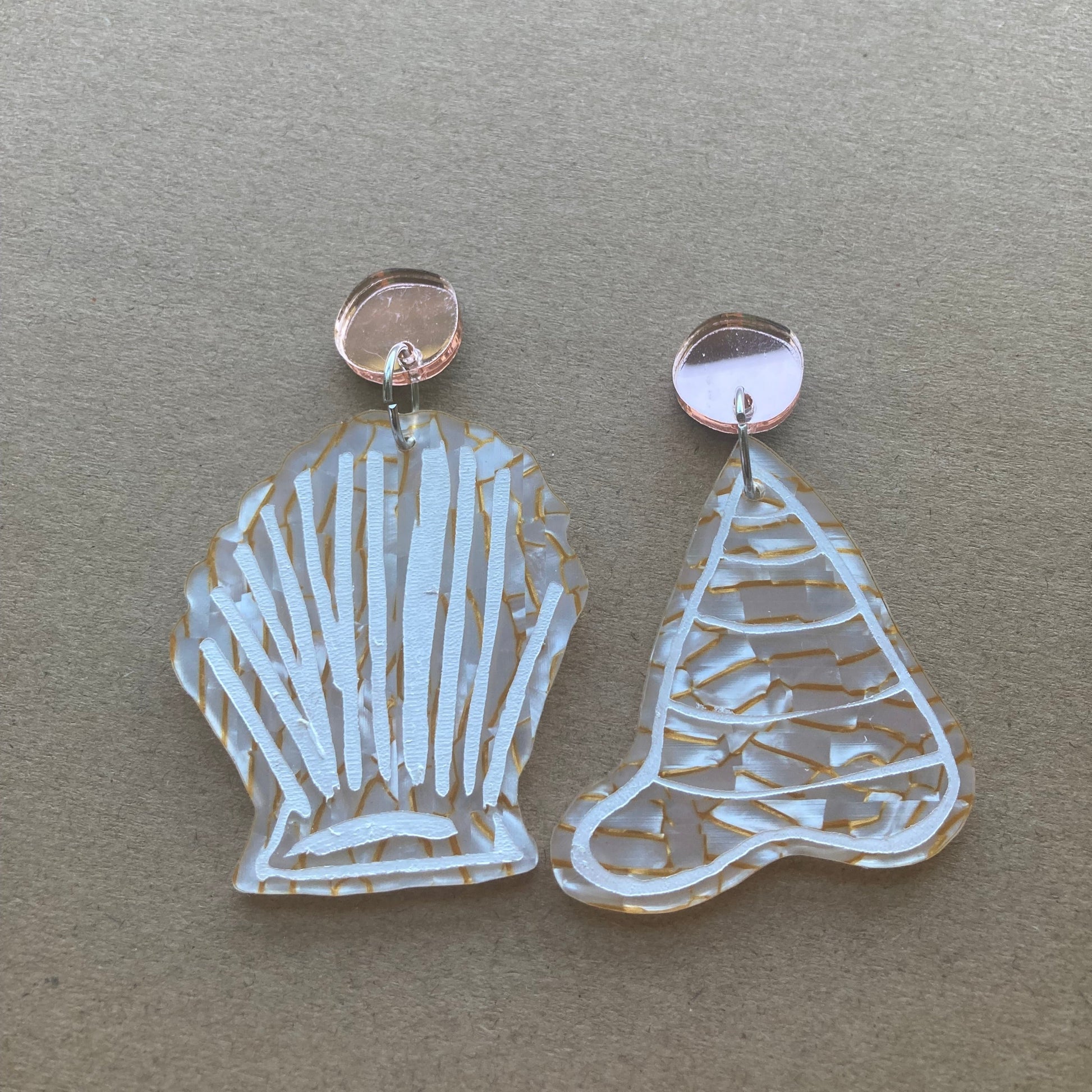 There are 2 types of gaanj earrings, a larger set with the fan and trochus shells (measuring approx. 4.5cm across) and the smaller set with the 2 long trumpet and cone shells (measuring approx. 7cm in length).