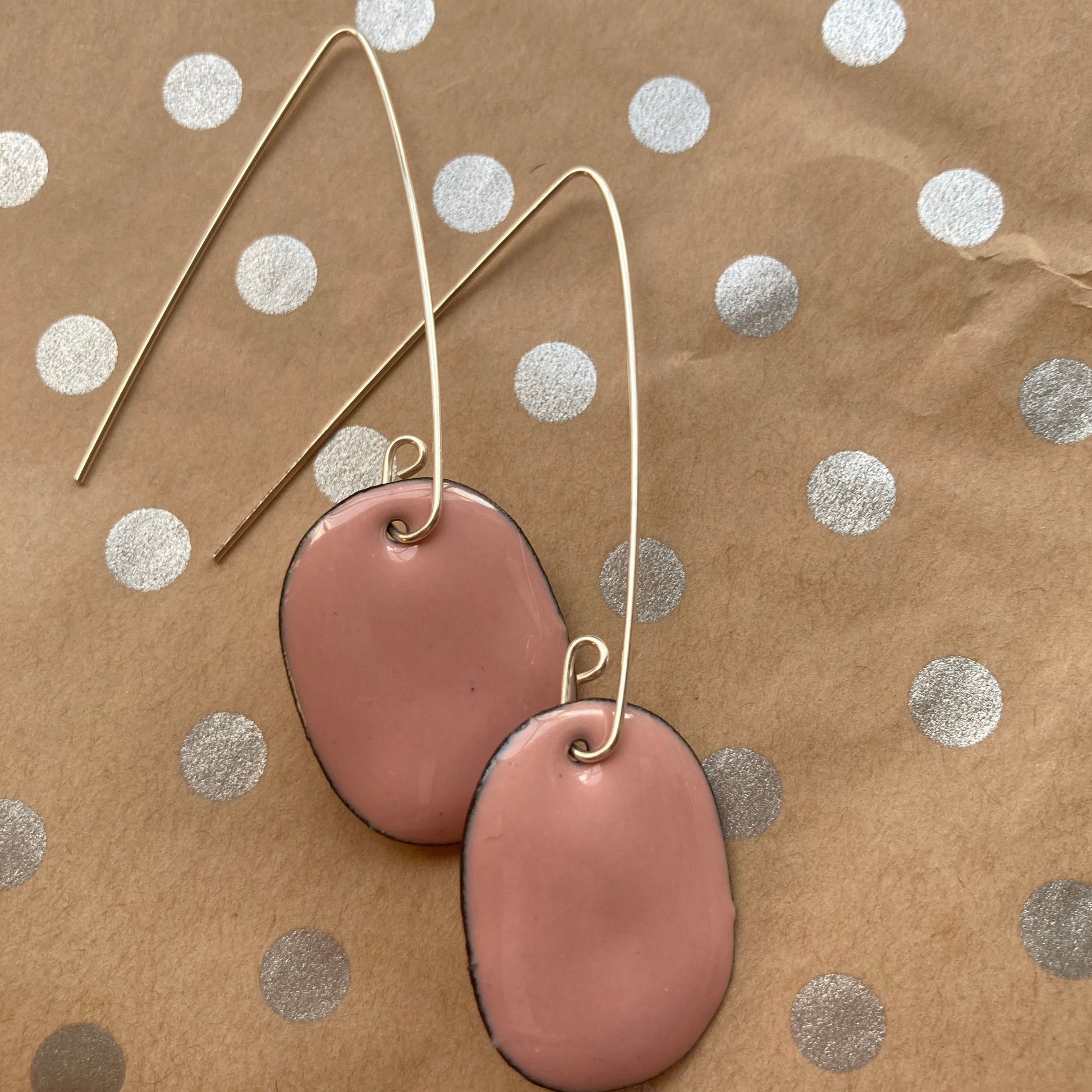 These gorgeous handmade glass enamelled organically shaped hoops in a perfect pink enamel with handmade sterling silver hooks.