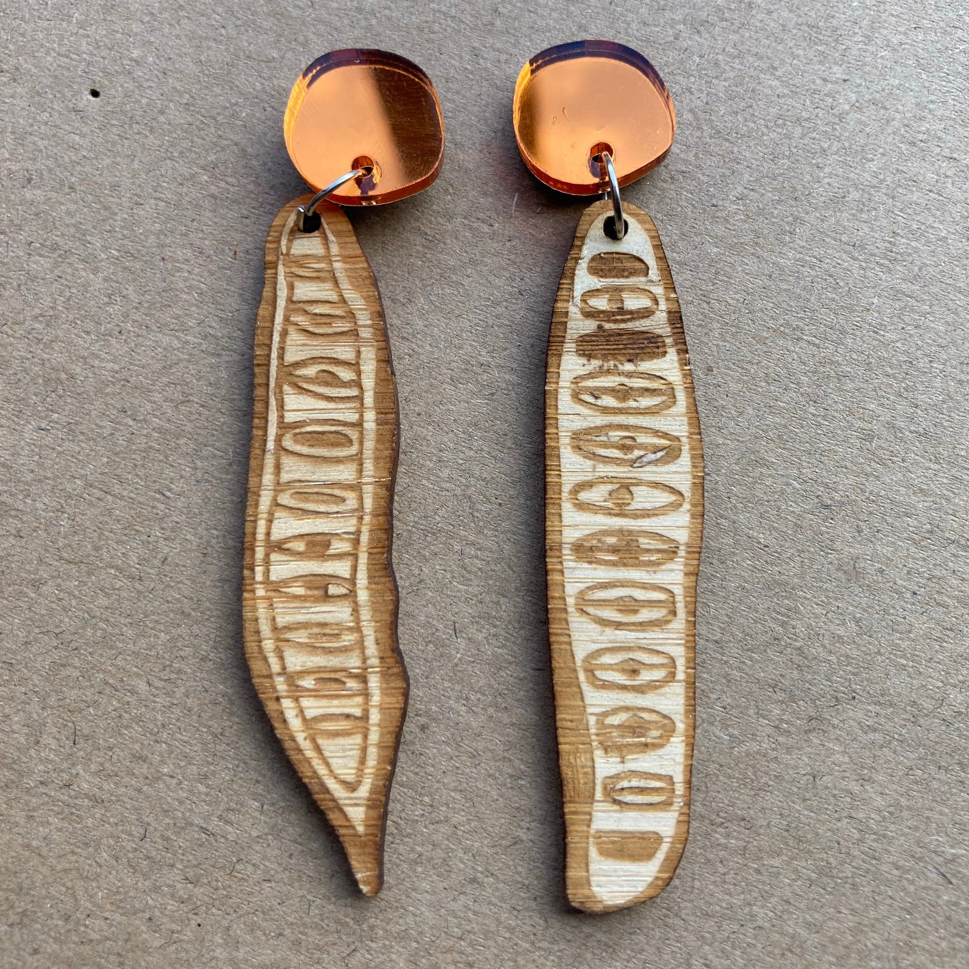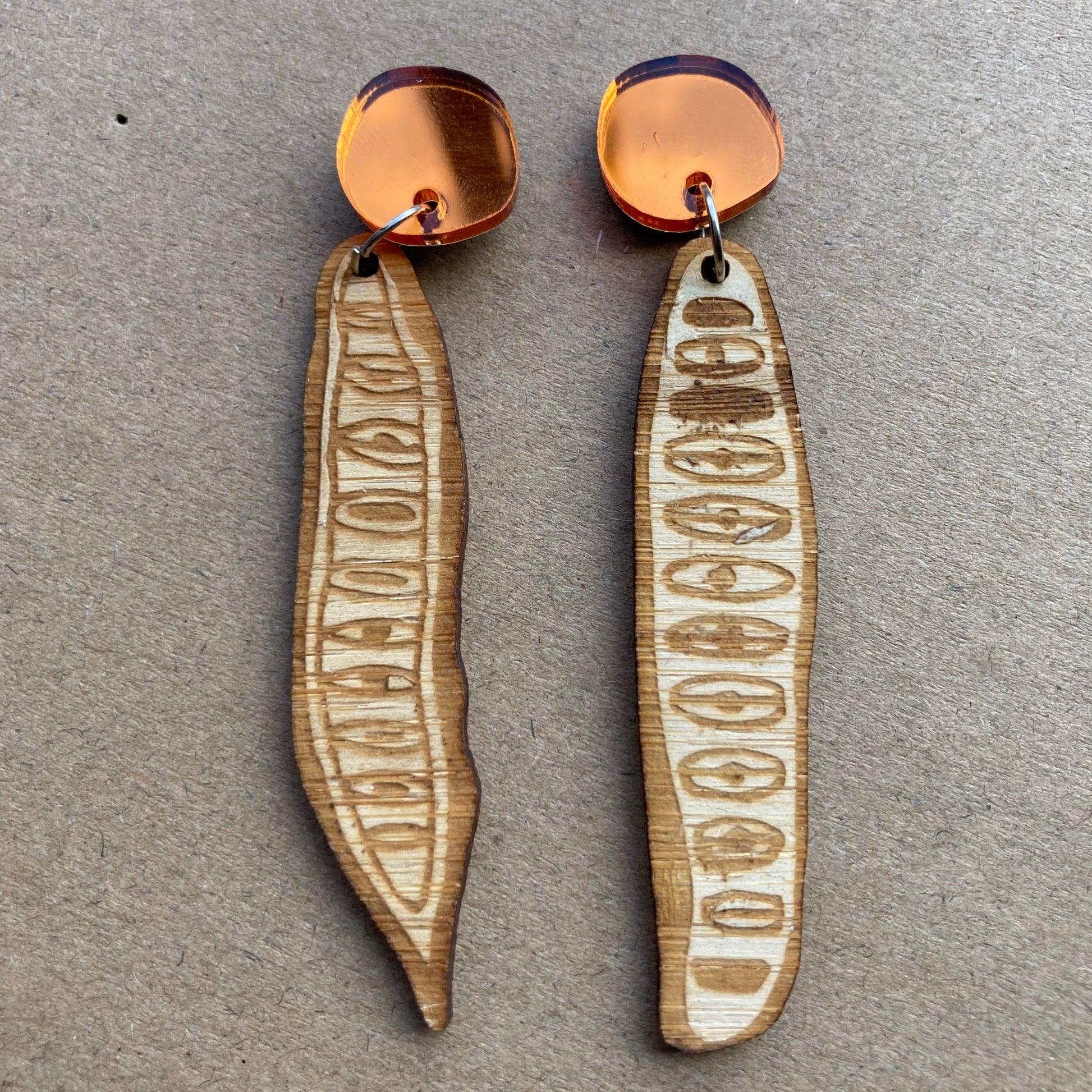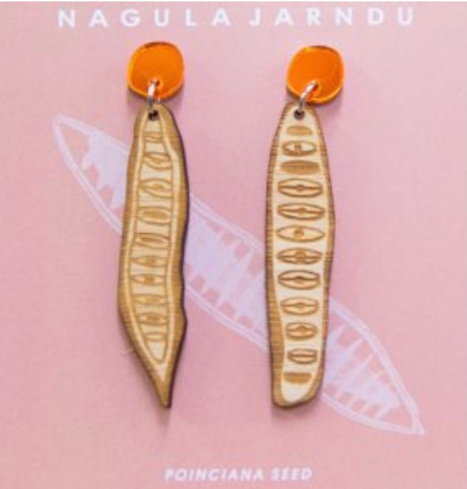Poinciana seed earrings designed by Walmajarri-Nyikina artist Gabriella Baxter.
