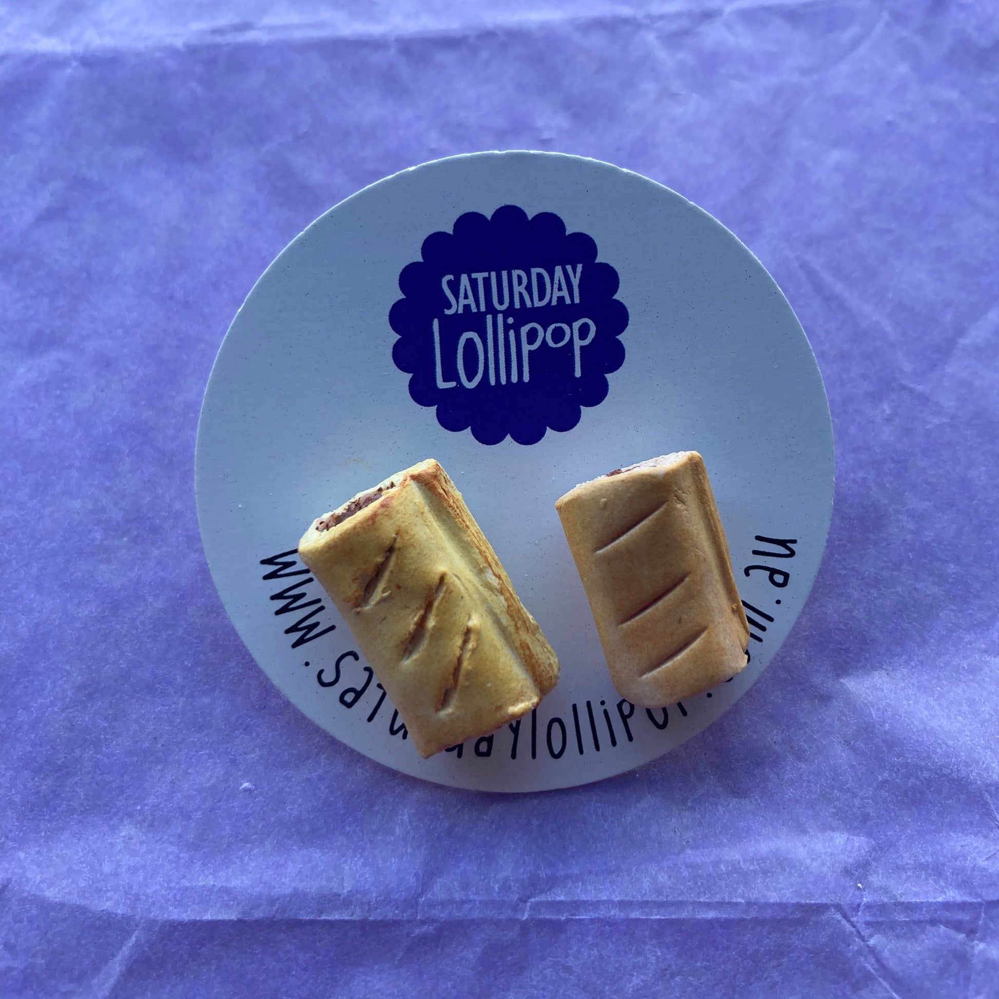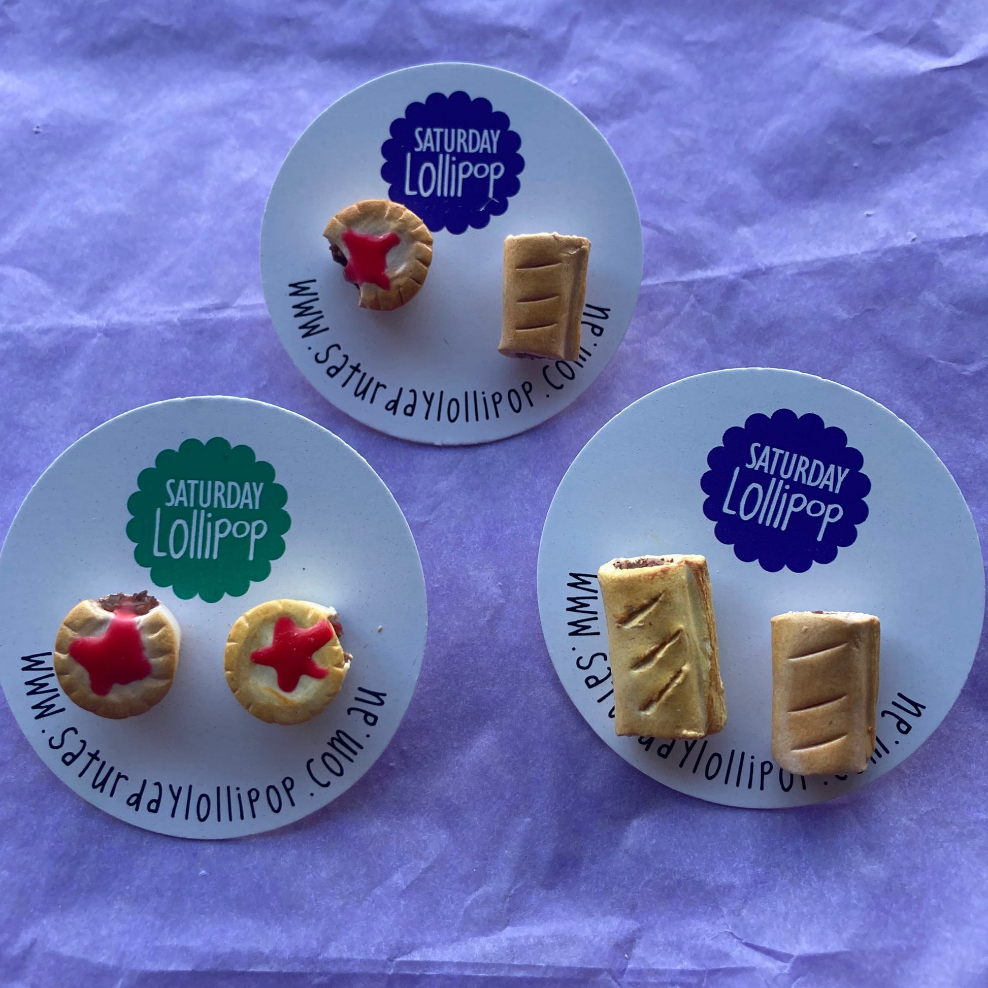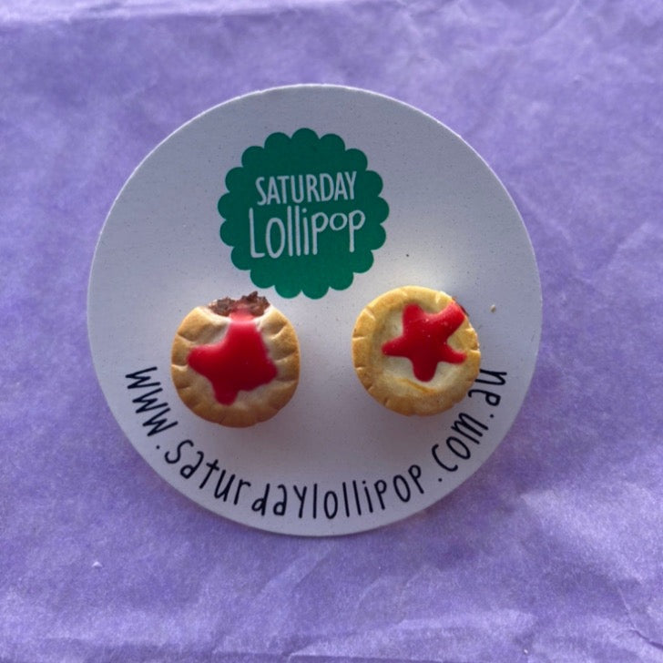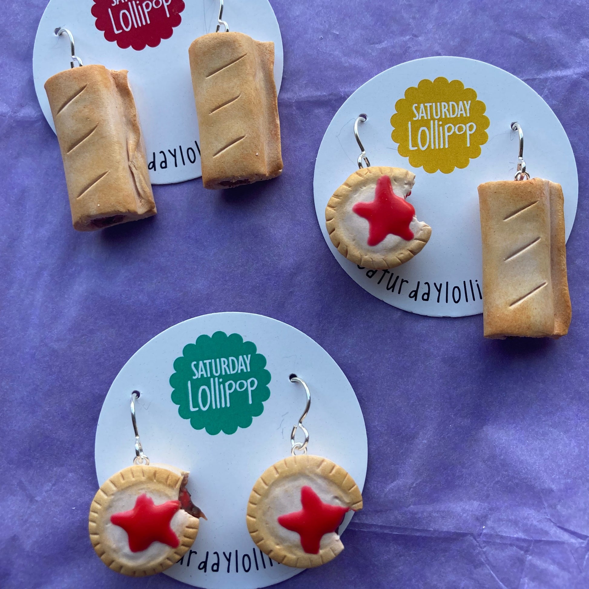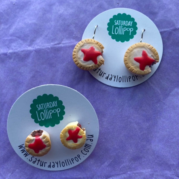 The dangles are larger, approx 2-3cm in size. The pie has a bite taken out and a sponge of sauce on top. Choose either matching dangles (sausage rolls or pies) or a mismatch pair with one of each. Silver plated earwires.