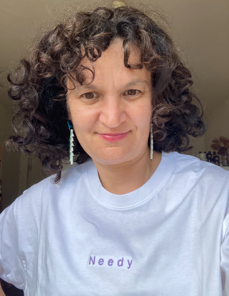 A white crew neck tshirt with the word Needy embroidered on in a lilac colour.